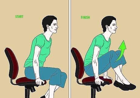 Use the sit and stand pose to engage your hamstrings. Sit with your knees at a 90-degree angle on the edge of your chair. Your back should be straight. Using only your legs, stand up slowly. Slowly lower yourself back into the chair; work against gravity as you sit down by not "plopping" down. Repeat 5 times.
