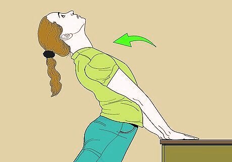 Do upward dog desk pose. Start with your body at a right angle to the desk with your upper body parallel to the floor. Stretch your arms above your head so they meet the desk. Lift your head and body up, bringing your hips in towards the desk and arching your head and back. Hold for 5 counts. Return to the right-angle pose.