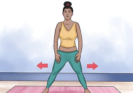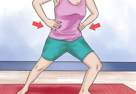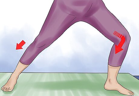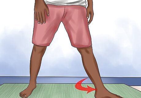 Turn your left foot out by 90 degrees. Next you should swivel your left foot out so it is at a 90 degree angle and your toes are pointing away from your body. Turn your right foot in slightly to help you keep stability and balance. To perform the pose on the other side, just switch legs. In other words, swivel your right foot out to a right angle, rather than your left foot.