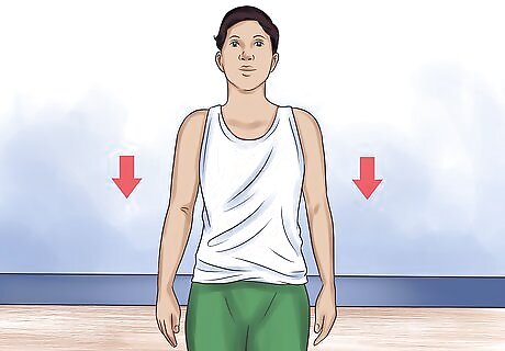 Get in the starting position. A good starting position for many yoga poses is the Mountain Pose. Stand with your feet together and your arms at your sides. Try to spread the weight evenly across your feet, and breathe steadily. If you are having trouble balancing, move your feet slightly apart. You can stand on a yoga mat if you have one. To do a mountain pose, stand straight and put your feet together. Place your weight evenly on both feet. Inhale, straighten your back, raise your shoulders lightly, and exhale to rotate your shoulders back and down. Stand with the image of a straight line from the top of the head to the heels. Hold this posture for about five breaths.