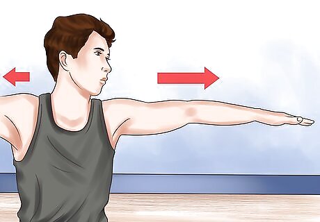 Raise your arms. Keeping your balance, raise your arms out to the sides. Your arms should be straight and pointing out to either side of you, with your palms facing the ground. Try to ensure that your arms are in line with your shoulders. Turn your head and look towards your left hand. Focus on the tips of your fingers as you stretch out your arms and extend out through your hands. Look towards the hand on the same side of your body where your foot is placed at the 90-degree angle.