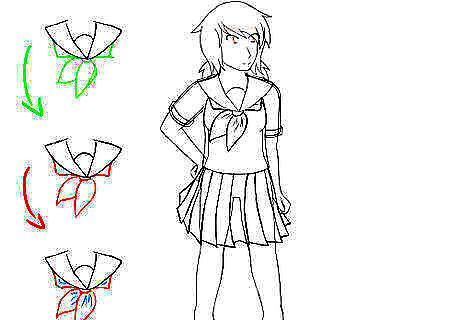 Draw the tie. The tie for the sailor fuku is often less of a tie and more of a handkerchief, which creates the classic knot that's often seen in anime and manga. The classic tie can be drawn with simple rectangular shapes or with teardrop shapes. If you're more advanced at drawing, try out drawing the wrinkles in the tie near the knot.