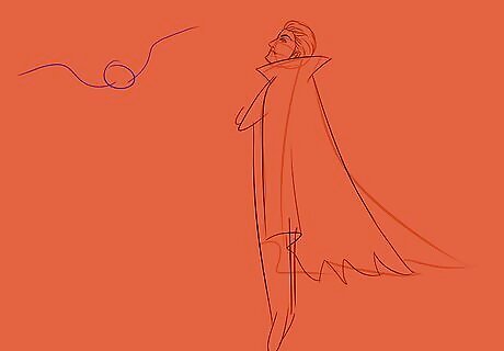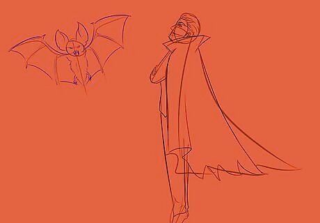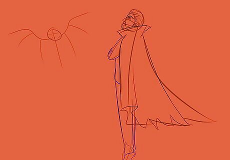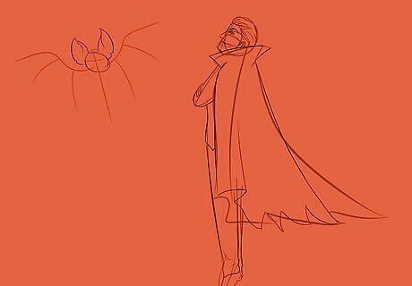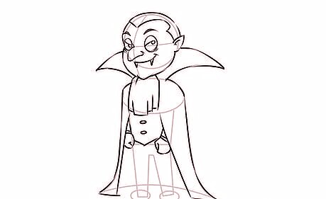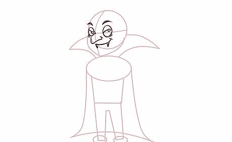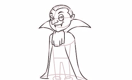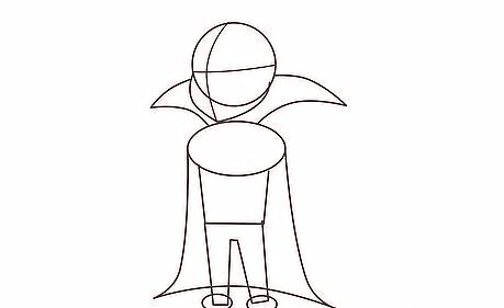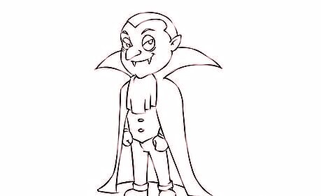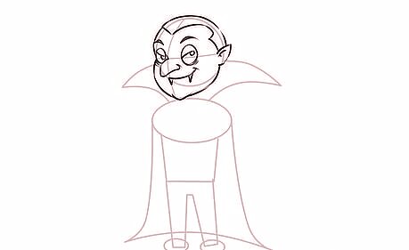 Draw an outline of the vampire’s body using a square. Draw the vampire’s legs using long lines and draw a circle for the feet.