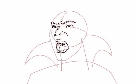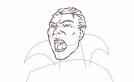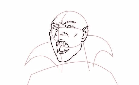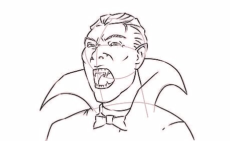 Draw a circle. Add an elongated angular shape for the vampire’s jaw line. Add a crossed curved line close to the left side of the drawing extending through the jaws.