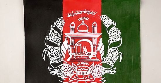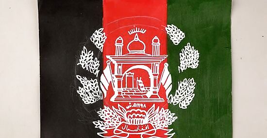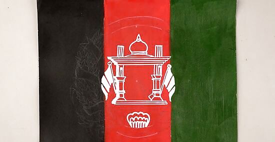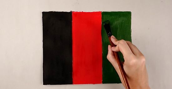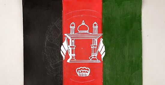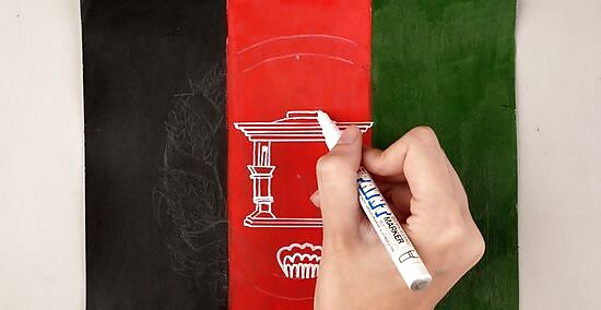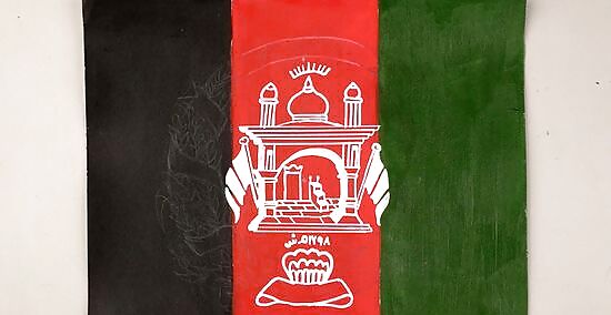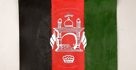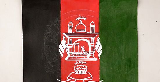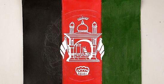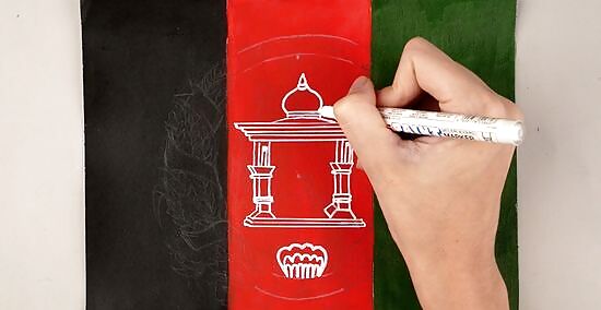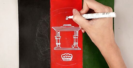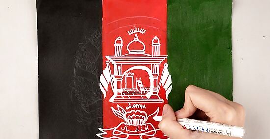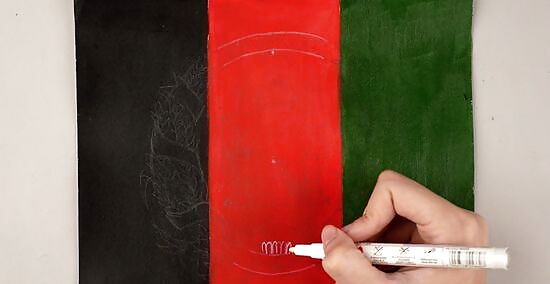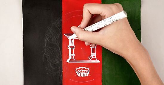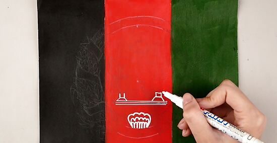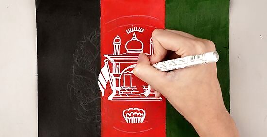 Color the vertical bands. The black band on the left symbolises the painful past of Afghanistan. The red band in the middle symbolises the bloodshed of those who died for their freedom. The green band on the right represents hopes for peace in the future.