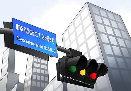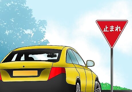 Learn traffic signs that are unique to Japan. Typically, traffic signs on main roads in urban areas are written in both Japanese and English. However, they're usually only posted in Japanese in less populated areas. Stay on the safe side and do your best to memorize important traffic signs, including stop and exclusive lane signs. In Japan, a stop sign looks like a red inverted triangle. The word “Stop” is written on it in Japanese; the English word “Stop” may appear under the Japanese script. Note that a stop sign is solid red, while a white inverted triangle with a red border means drive slow. Watch out for blue signs with an arrow under an image of a bus. That means the lane is only for buses. Similarly, a blue sign with an arrow under a bicycle indicates a bicycle-only lane. Many of the signs you'll see in Japan are fairly self-explanatory or similar to those you'd find in the U.S. and other countries. For instance, a yellow sign with 2 curved lines beneath a car means slippery road. Review a full listing of Japanese road signs at http://www.jaf.or.jp/e/for-overseas-drivers/driving-in-japan.htm.