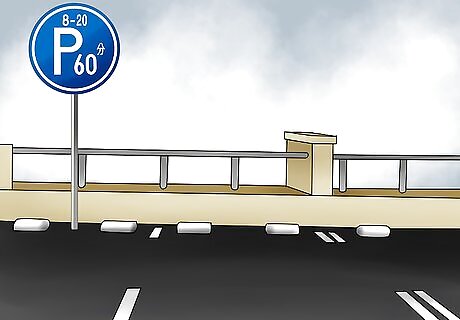 Park only in designated areas. Roadside parking is hard to come by in Japan, especially in metropolitan areas. Circular signs with a red diagonal line means no parking; signs with a red “X” mean no stopping or parking. As a rule of thumb, it's better to just assume there's no parking on a street if you don't see a sign, especially if you're in a big city. Parking lots in big cities tend to be pretty expensive, or upwards of ¥1,000 per hour ($10 U.S. dollars or more). Fees decrease as the population becomes less dense, and free parking is easier to come by in rural areas. In metropolitan areas, elevator parking lots are common. They're pretty cool! You park on a lift, pay the fee, and your car is either sent up in a tower or stored underground.