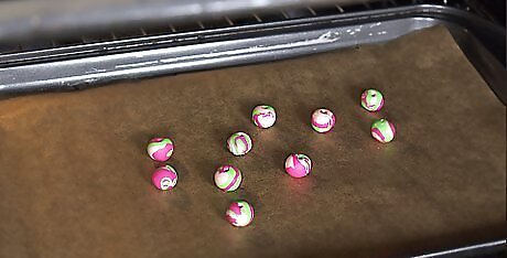 Place the clay in an oven tray lined with foil or baking paper. This prevents the clay from sticking to the tray. Take a plastic or metal oven tray and pull out a sheet of paper. Then place the clay in the center of the tray. The clay doesn’t expand when it heats, so you can place multiple models close to each other. To save paper or foil, you could also use a small section for each model instead of lining the whole tray.
