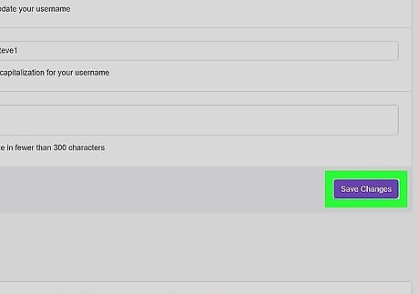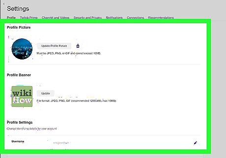Edit your profile. You default to the Profile section of settings, so you will see all the changes you can make to your profile here. Click Add Profile Picture to change your icon. This file must be JPEG, PNG, or GIF and cannot exceed 10MB. Your file browser will open for you to choose your picture. After you double-click on an image file to open it, you'll see another window pop up for you to zoom on your file if you want. Click Save to finish. Click Update under "Profile Banner" to change your profile banner. Accepted file formats are JPEG, PNG, GIF (recommended 1200x480, max 10MB). You can change your username if you see a pencil icon. If not, there should be a message under your listed username that tells you when you can change it. You can edit the capitalization of your username for your display name. For example, your username may be fluffycat, but you can have the display name set to show FluffyCat. Click in the box next to "Bio" if you want to edit your bio. You have up to 300 characters to use in this box.
