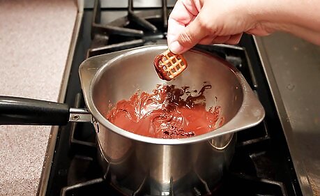 Dip strawberries, pretzels, cookies, peanut butter crackers, etc. into the chocolate. Tongs may be helpful.
