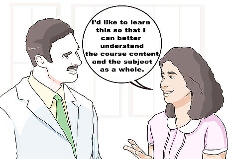 Say you don’t know. You will have science questions that you cannot answer on your own. That is alright. Tell your teacher you don’t know, but that you want help finding the answer. Saying you don’t know reinforces the idea that scientific learning is not about memorizing facts, but rather about critical thinking and investigating. Read through your class materials and textbooks thoroughly to gather the information already available to you. If class materials don’t answer the question, look for online resources that can help explain. There may be videos, games, or even another teacher’s lesson plan that you could use. Ask to meet with your teacher outside of class to help explain the concept. Tell them “I’d like to learn this so that I can better understand the course content and the subject as a whole.”