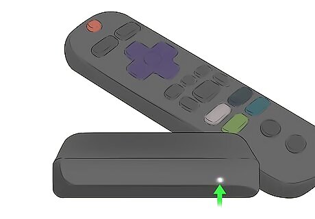 Turn on your Roku device. Make sure the white light on the front of the Roku is on. If not, press the red power button on the Roku remote. If it still remains off, check that the power cable is securely connected to the Roku and wall socket then press the power button again.