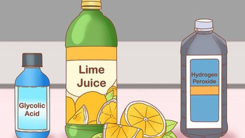 Use common household items to lighten your tattooed skin naturally. Lemon and lime juice, glycolic acid, and hydrogen peroxide can all produce mild bleaching action when applied directly to the skin. Chances are, you have one or more of these items sitting around in your pantry or medicine cabinet right now. Some holistic skincare experts also swear by the skin-lightening properties of undiluted essential oils, such as lavender oil. Avoid mixing multiple lightening agents. Not only will this not make them more effective, it could cause an unsafe chemical reaction. The actual effectiveness of topical skin lightening solutions is up for debate. If you decide to experiment with any of these substances, you'll be doing so at your own risk. There's a chance that they may not work permanently, or that they could result in scarring or similar damage.