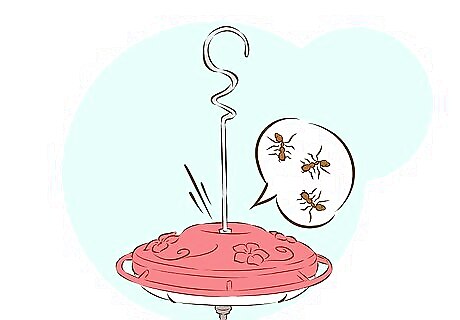 Use an ant guard. Hummingbirds will not come to a feeder that is covered in ants or that has dead ants swimming in the saucer. To prevent ants from spoiling all your efforts, use an ant guard – it's a little tray that's full of water (a moat, really) that you attract the cord on top of your feeder. The ants can't pass the water without drowning. Some feeders come with this while others do not. In certain home and gardening stores (or online) you can purchase an ant guard individually. Some people suggest putting putting petroleum jelly on top of the feeder to create a sticky goo the ants get through. This may work, but in hot weather, you run the risk of the jelly melting and getting into the birds' food.