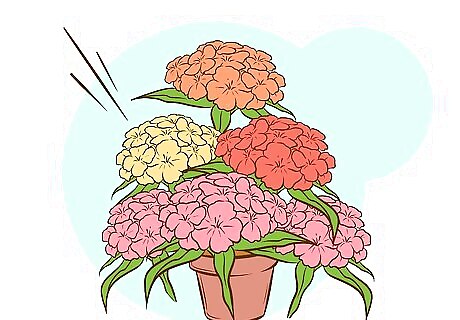 Plant red, orange, and yellow flowers in your garden. Another way to get hummingbirds to your garden is to plant a garden full of brightly-colored flowers. The more eye-catching your garden, the better. Here are some flowers you can plant: Geraniums Fuchsia Trumpet vines Columbine Petunias
