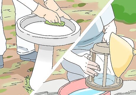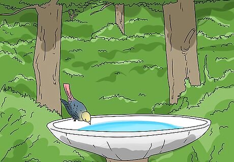 Clean birdfeeders and birdbaths twice per month. You should clean your birdfeeder and birdbath thoroughly 1 to 2 times every month. Regularly cleaning your birdfeeders will help prevent the spread of germs and disease among the birds that visit your yard. To clean your birdfeeder or birdbath, soak it in a 9-to-1 water-bleach solution and then rinse it thoroughly. If birds at your feeder appear to be listless and have feathers in poor shape, you may have a disease problem at your feeder. If this is the case, clean your feeder twice as often. Regularly sweep debris off the ground below the feeder. This can also help prevent the spread of disease.