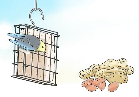 Put out suet cakes and peanuts. Suet cakes and peanuts are great sources of energy for birds during the cold-weather months. Suspend suet cakes from wire mesh cages, and smear peanut butter and suet mixes onto tree bark. When putting out peanuts, make sure they are fresh, unsalted, and unroasted. These foods are especially favored by chickadees, nuthatches, woodpeckers, and jays.