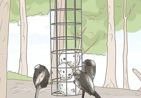 Offer birds fat balls or fat-based bars. Birds need fat to survive the cold-weather months. To help them out, you can put out fat balls or fat-based bars that are made specifically for birds. Don’t give birds margarine or vegetable oil meant for human consumption. Stick to what is made specifically for birds.