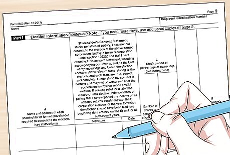 Have all shareholders complete and sign the consent statement. The second page of Form 2553 has space for all shareholders to sign a consent statement for the election of S-corporation status. If there isn't enough room, you can print and attach additional copies of the page. Each shareholder must also include personal identification information, the number of shares or percentage of ownership they have in the company, and the date they acquired that ownership interest.