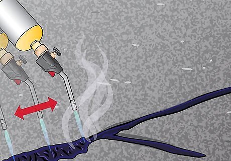 Melt the crack filler rope with the propane torch. Sweeping slowly from side to side on a section of 12 inches (30 cm), focus the propane torch's tip on the rope until it begins to melt. Once it starts melting, move onto the next section. Repeat until the filler begins to level out and sink into the crack. The filler may begin to burn. Don't panic! Just blow out the flames and start again, this time a little farther away from the filler.