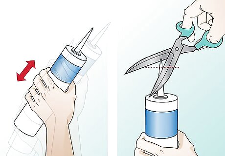 Prepare your asphalt sealant by shaking it and cutting the tip. Mix up your asphalt crack sealant by shaking it up and down. If you're using sealant for a caulk gun, cut the tip with scissors, making sure that the spout is no larger than the crack itself. You may need to break the seal inside the tip, so stick a wire hanger or something similarly sturdy into the tube’s tip before trying to use it. If there is a seal, you’ll feel it break.