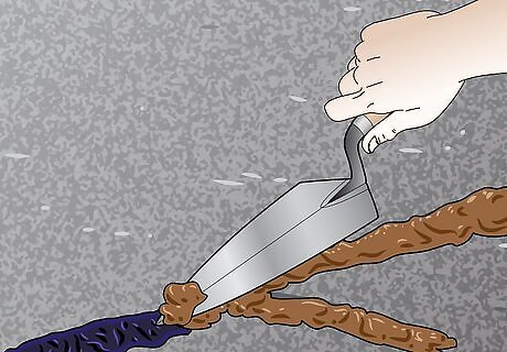 Fill the crack with sealant, then even it out. Apply the sealant, starting at the bottom of the crack and working your way down its length. Layer the sealant until it’s flush with the top of the crack. Use the trowel to even out the sealant and tamp it down into the crack. If this pushes the sealant below the top of the crack, apply more sealant until it’s full.