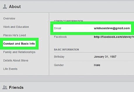 Click Contact and Basic Info. It's in the list of options along the left side of the screen. As long as your friend has not hidden their email address, you'll see it beside the word “Email” in the center panel of the screen. If you don't see an email address listed, your friend may have chosen to hide it by adjusting their privacy settings.