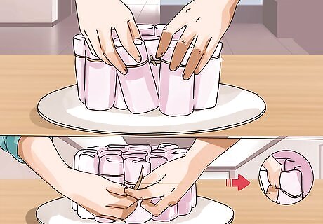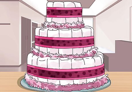 Add color to the tiers with decorative ribbons. Choose some decorative ribbon in your color scheme, theme or patters to adorn the diaper cake. Wrap each layer in colorful ribbon, Cut it to fit and secure the ends together with hot glue. You may choose to use two different ribbons on each layer. Choose one thicker and one thinner ribbon. Put the thicker ribbon in place first, then wrap the thinner ribbon around the center of the thicker one. This creates a layered look and can allow for more colors or patterns.