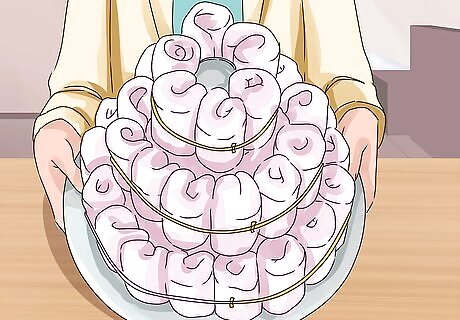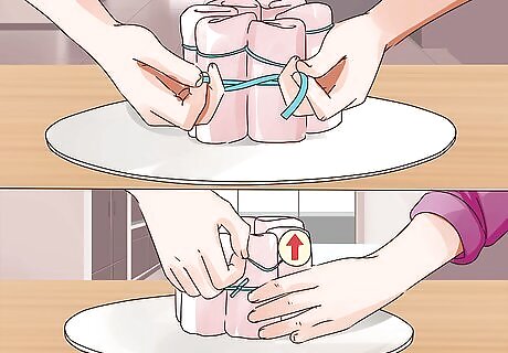 Finish the tiers with a third layer. Roll six diapers and secure them with rubber bands, then stack them on the second tier around the top of the paper towel roll. Secure these diapers to the paper towel roll with curling ribbon, and remove the rubber bands.