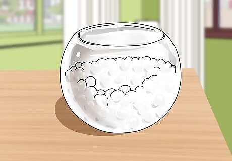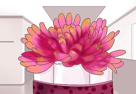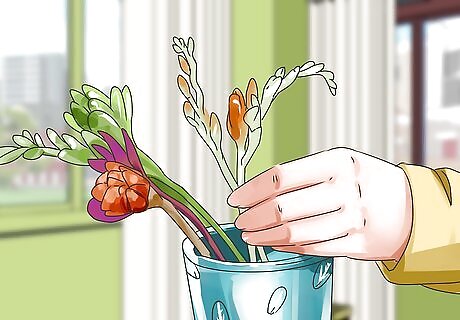 Arrange your flowers in the vase. You may choose to arrange the flowers yourself or have a professional do this for you. If you choose to have a florist make the arrangement for you, take your color palette and vase or base combination to the flower shop, so that you can explain exactly what your vision is for the centerpiece. To arrange the flowers yourself, work in layers. Create a base, support layer with leafy green stems or dense flowers like baby's breath. Trim these stems about half an inch from where they create a “v”, then criss cross them from the corners or edges of your base to create a good support base for the rest of the arrangement. Remove the bottom leaves to avoid molding the leaves and rotting the water. Trim the flowers as you go to fit the your height preference. Start with your largest blooms, then add different types of flowers with progressively smaller blooms. Add odd numbers of each type of flower until your arrangement looks complete.