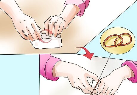 Roll diapers and secure them with rubber bands. Start at the top, open edge of a disposable diaper and roll toward the bottom. Wrap a rubber band around the center of the roll to hold it in place. Repeat this process with six diapers. Cloth diapers can also be used. First fold them into a square, then roll them and secure them with rubber band.