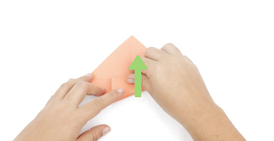 Fold the bottom right side up to meet the center crease. Keeping the square oriented like a diamond, bring the bottom point up and to the left. Line up the bottom right edge with the horizontal crease in the middle of the paper. Run your finger over the fold to crease it so the paper will stay folded down.