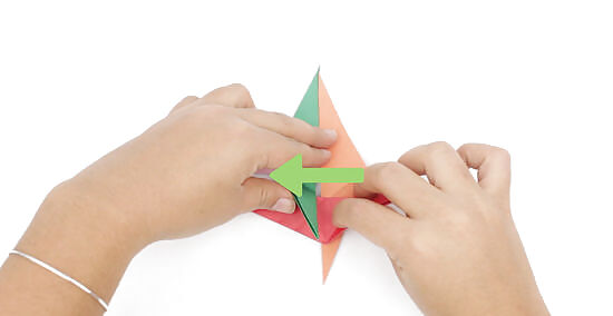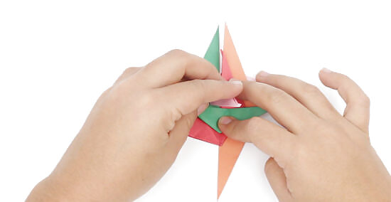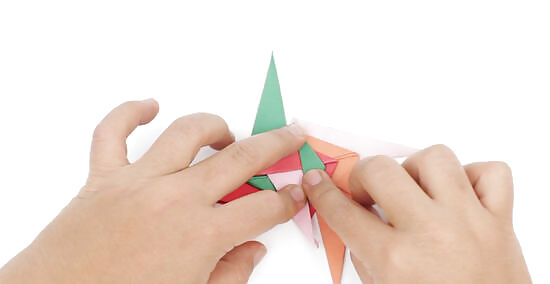 Repeat this step with the other units, working clockwise. Next, you’ll fold along the valley line for unit A, bringing its point up to the right and keeping its long edge in line with the center. Do the same thing with unit C, re-folding its valley fold so the point comes downward and its long edge is flush with the center line.