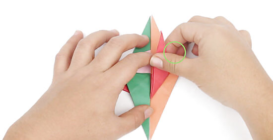 Lift up unit D’s folded piece and re-fold unit B’s valley fold beneath it. Since unit B’s valley fold has been hidden by the other piece, you’ll need to lift the first piece we folded out of the way. Fold along unit B’s crease, bringing its point downward and it’s long edge in line with the center. Lay unit D back over the top of unit B when you’ve finished the fold. This completes 1 rotation.