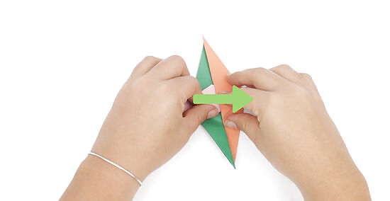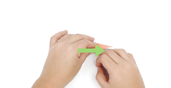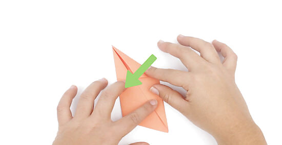 Fold over the left edge to line up with the center crease. Bring the left side of the triangle over to the center. Line up its top edge with the triangle’s center crease. Once you have it in place, press the fold down to crease it. At this stage in the folding process, your shape should have 1 point pointing downwards and 1 pointing out to the right.