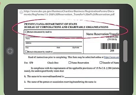 Reserve your name. When you have chosen a name, reserve it by filing a Name Reservation form (Form DSCB:15-208) with the Pennsylvania Department of State. Your reservation will hold for 120 days while you register your business. With your form, pay a filing fee of $70. You can fill this form out online at [1] or print it and mail it to Pennsylvania Department of State Bureau of Corporations and Charitable Organizations, P.O. Box 8722, Harrisburg, PA 17105-8722. Use black or blue ink if you are filling the form out by hand. Bank applications are held for six months.