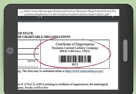 Submit a Certificate of Organization. Officially create your LLC by filing a Certificate of Organization Domestic Limited Liability Company (Form DSCB:15-8913) with the Department of State. Fill out Pennsylvania Articles of Organization online at [2], or by printing and mail it to "Department of State, Corporation Bureau, P.O. Box 8722 Harrisburg, PA 17105-8722." If you are filling out your form by hand, do so with blue or black ink. With your certificate, send your New Entity Docketing Statement (Form DSCB:15-134A). You will need to know your EIN to complete this step. With your certificate and statement, send a filing fee of $125.