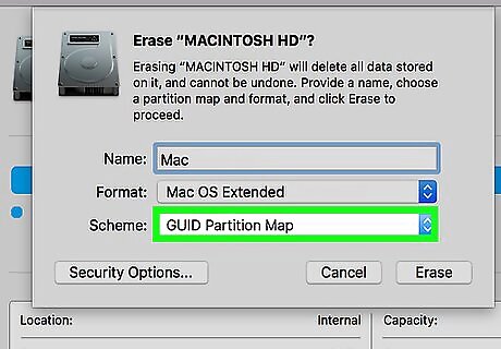 Select GUID Partition Map for the drive scheme. Click the drop-down box next to "Scheme" and select GUID Partition Map. This is the default partition scheme for drives formatted in the OS X Extended format.
