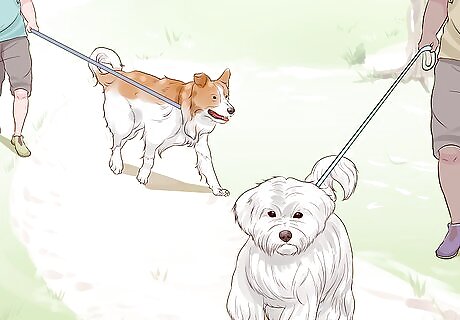 Proceed slowly and cautiously. Get two handlers, one for each dog, and have them hold the dogs leashed a good distance away from one another. The two handlers should slowly walk forward, pausing if they sense their dog is tensing up. This whole process should go slowly and methodically, which will help to calm the dogs as well.