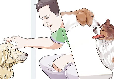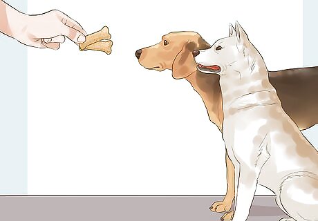 Give positive attention to both dogs. It is important to provide visible and physical affection to both dogs throughout the introductory process and beyond. Give treats to them together. Buy toys for them separately and for them to play with together. Make sure that there are plenty of toys and treats, so that the dogs will not feel the need to compete.