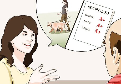 Keep your grades up. Keeping your grades in good standing is another important way to show that you are responsible. If your grades are low, now is the time to improve them. By improving your grades on your own, you are demonstrating a certain level of responsibility and initiative—skills that are needed to take care of a dog. If your grades are low, speak with your teacher and other students about ways to improve your grades. If you have good grades, use this as a way to demonstrate to your parents that you have a sense of what responsibility entails. Hopefully, this will help your parents to change their decision.