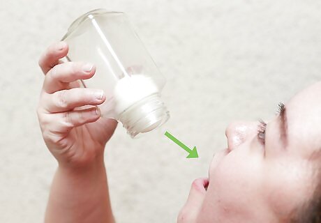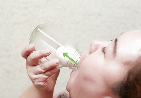 Blow hard into the bottle. With your mouth around the bottle, start blowing as hard as you can into the bottle. The air will go past the egg and build up the pressure behind it. As the pressure builds, the egg will be pushed back out of the bottle. Depending on how much pressure you build, the egg will either slide out slowly or pop out rather quickly. Take care not to get hit in the face with the egg when you take your mouth off the bottle. If the egg doesn’t come out, you need to blow into the bottle harder. The egg may land in your mouth, but it should remain intact. Take care not to choke on the egg.