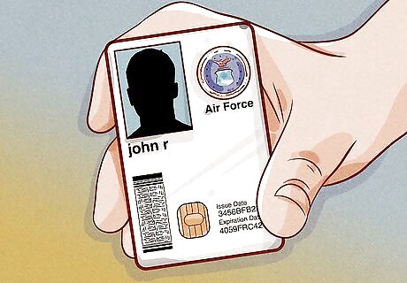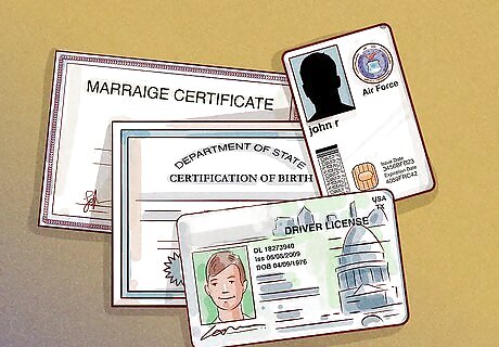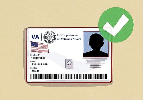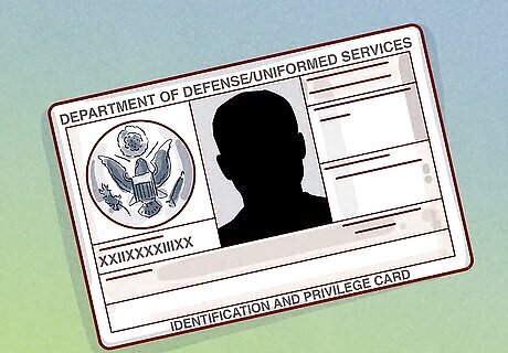 Gather documentation of your eligibility. If you are a retired service member or a sponsor of a family member, you must provide at least 2 forms of ID and documents that verify your veteran status. A family member over the age of 18 must also provide 2 forms of ID as well as documents that prove the relationship between the family member and the sponsor. All documents must be original documents or certified copies. Documents may include: A government-issued photo ID, such as a driver's license or a passport An old active-duty military ID A marriage certificate (for spouses of retired service members) A birth certificate, adoption decree, or legal guardianship decree (for children of retired service members) A death certificate (for family members of a deceased retired service member) DD Form 214, "Certificate of Release or Discharge from Active Duty," or retired pay orders. If you are 65 or older, you can also provide proof of enrollment in Medicare Part B.