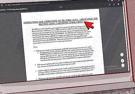 Register with the Defense Enrollment Eligibility Reporting System (DEERS). To register with DEERS, you must have a completed DD Form 1172-2. If you are the spouse or dependent of a retired service member, they will need to fill out parts of this form for you. You can download the form at https://www.cac.mil/Portals/53/Documents/dd1172-2.pdf. Instructions to fill out the form are available at https://www.cac.mil/Portals/53/Documents/1172-2-Instructions.pdf.