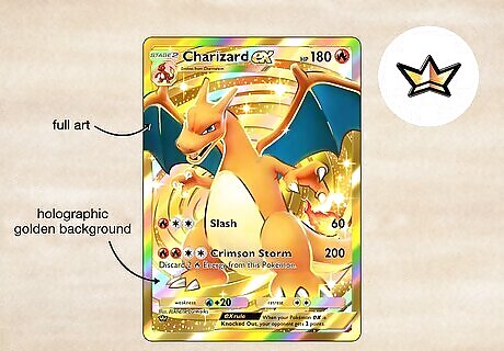Ultra Rare Ultra Rare cards are most notable for their full art and their holographic golden background. There are usually only 1-3 Crown Rare cards released each expansion, and they have a low chance of appearing when you open boosters, making them the rarest cards in the game. Rarity Symbol: Crown Example Cards: Charizard EX, Pikachu EX, Mewtwo EX, Ho-Oh EX, Lugia EX, Mantyke