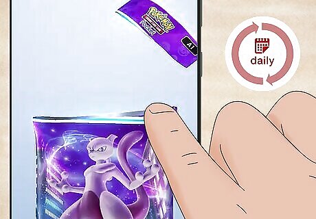 Open new booster packs daily. You get 2 booster packs per day, and new ones replenish every 12 hours. Keep consistently opening packs so you’re more likely to find rare cards. Spend Hourglasses to open packs sooner. Every Hourglass you spend shaves 1 hour off of your wait time. Even after new expansions releases, you can go back and choose old booster packs to complete your collection.