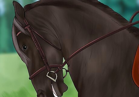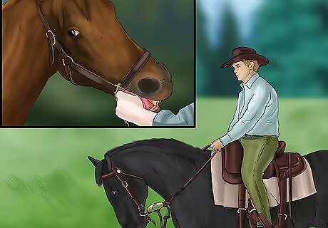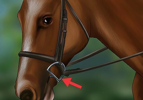 Choose the right bit. If it’s too large, you could injure your horse and undo the work you’ve already put into training it. Even large horses don’t really need large bits. The bit sits at the back of the mouth on your horse’s gums. This soft tissue is full of nerve endings that make this spot extremely sensitive. When selecting a bit, you’ll need to consider the width and shape. For the best results, a wider bit with a curved shape is ideal. Different bits have different purposes for various types of training. Make sure you have chosen the right bit for the job by considering how you want to ride the horse. Thinner bits can be painful for the horse and they also put more pressure on a concentrated area, leading to discomfort. A curved bit allows more space for the horse’s tongue, so the movement of the bit has the intended interaction with the sensitive soft tissue in your horse’s mouth without gagging the horse.