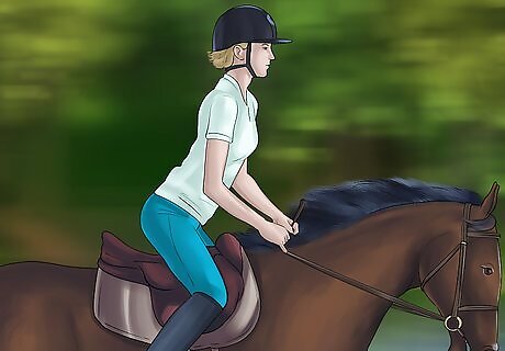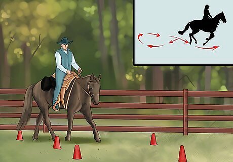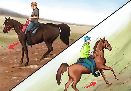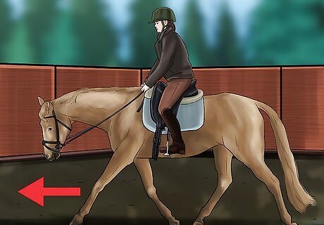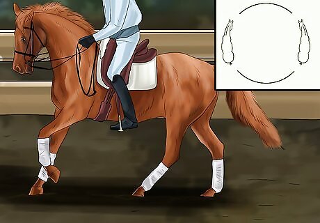 Practice the figure eight. This is an easy method to train half halt. You’ll need to slow the horse slightly by squeezing both calves and sitting lower in the saddle. Then, use the rein to shift the pressure on the bit slightly to one side. Allow the horse to follow all the way through the curve and straighten out facing the opposite direction. Then, perform the same change to go back the other direction. Do not pull the horse from the front. Use gentle pressure to tell them where you want them to go, and allow the horse to proceed.