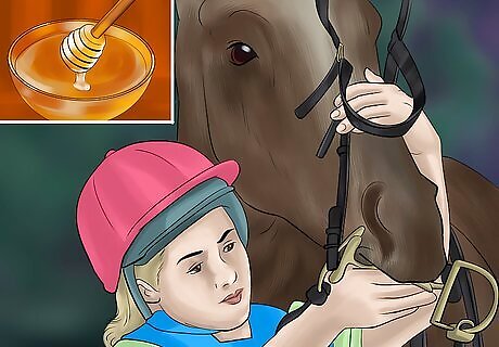 Sweeten the bit. Place a small amount of honey or molasses on the bar that goes across your horse's tongue. This makes the bit seem interesting to your horse. The horse will likely take the bit into its mouth happily. However, once the sweet stuff is gone, your horse may spit the bit right back out. Keep practicing. After a while, your horse should start relating the bit with a sweet treat and take it willingly. You can ask or encourage the horse to take the bit by tickling the corner of his mouth with your finger. Then, when he opens his mouth, introduce the sweetened bit.