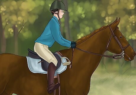 Assess your connection to the horse. Known as contact, this may be the most important part of your warmup. If your horse isn’t connected to you, responding easily to your commands and concentrating on following your lead, they are not going to be as successful with more advanced instructions. Your hold on the reins, posture, and leg movement all affect your connection with the horse. Be aware of every moment and how it impacts your connection with your horse. Keep the weight of the reins even between hands. This places consistent pressure on the bit, ensuring your horse will notice when you place more on either side to begin turning. Make sure that there is an equal amount of length on both sides of your reins. This will help to ensure that you are not pulling too much on one side or the other. Establish a consistent resting state of the reins. Your reins shouldn’t be constantly pulled tight or left lax. Instead, find a happy medium between the two, and continue to hold this contact. Keep in mind that having good contact and a connection with your horse is not a given. Talk to experienced trainers, watch videos, and get help to work towards achieving this using proper methods. True connection takes time. You will not achieve this natural feeling of communication with your horse in one ride. Keep practicing every day.